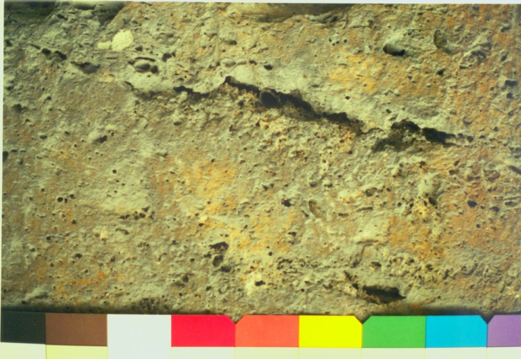 I dati alfanumerici e d'immagine (fotografiche e numeriche) prelevati con apposita campagna "in situ" sono stati utilizzati per le prove.Le applicazioni delle procedure di elaborazione sviluppate alle immagini del caso di studio sono: acquisizione numerica tramite scanner degli originali fotografici, correzioni cromatiche basate sulle tabelle di taratura, simulazioni di pulitura con trasformazione non dispersiva spazialmente.Esempio 1: travertino acquisito (136K) fotograficamente con illuminazione naturale e versione corretta cromaticamente (128K) attraverso la trasformazione ai minimi quadrati basata sulla tabella di taratura Kodak inclusa nella ripresa.